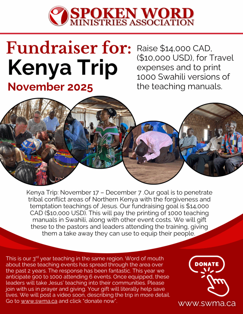 Kenya Trip: November 17 – December 7. Our goal is to penetrate tribal conflict areas of Northern Kenya with the forgiveness and temptation teachings of Jesus. Our fundraising goal is $14,000 CAD ($10,000 USD). This will pay the printing of 1000 teaching manuals in Swahili, along with other event costs. We will gift these to the pastors and leaders attending the training, giving them a take away they can use to equip their people.